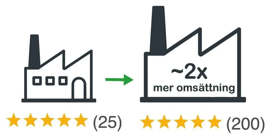Företag som får in över 200 recensioner brukar i snitt omsätta nästan dubbelt så mycket som de med 25 – enligt oberoende undersökningar. ¹