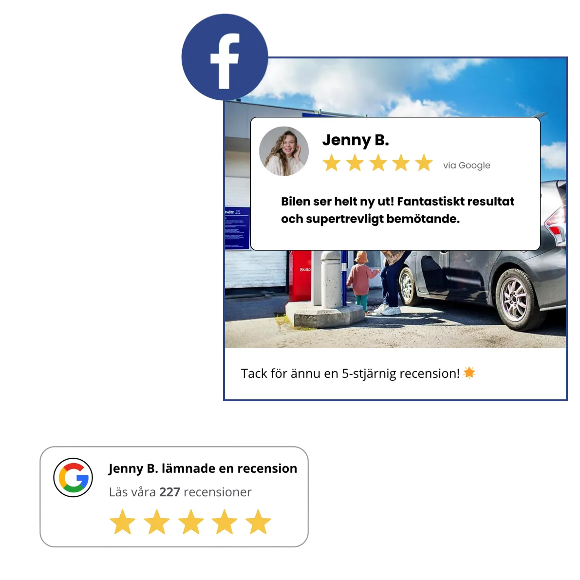 Dina bästa omdömen blir automatiskt inlägg för dina sociala media sidor antingen av oss eller dig. du får också en trustbadge av oss som du kan ha på din hemsida och visa upp alla dina nya reviews.