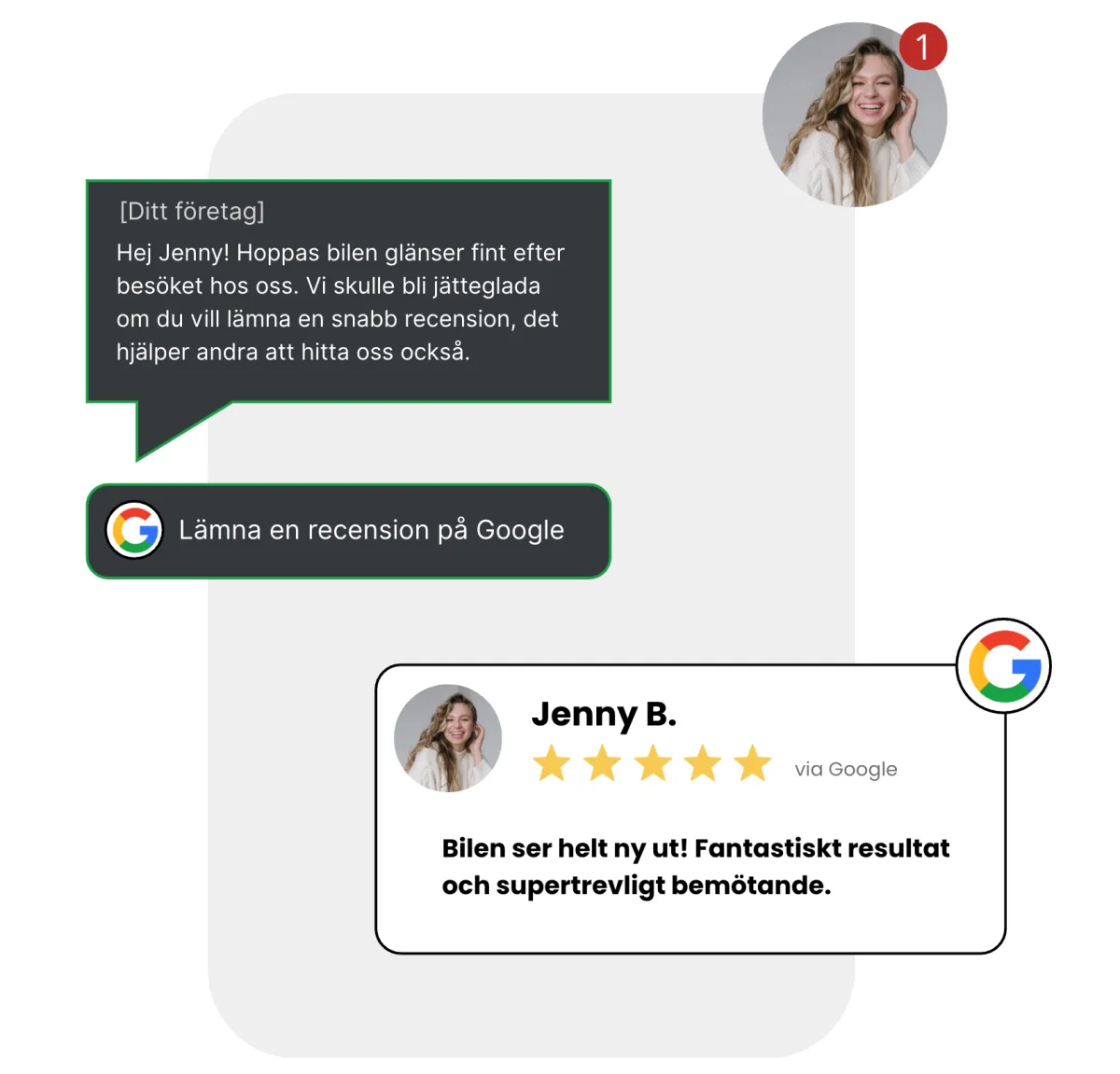 Varje gång du får en nöjd kund, skickas ett personligt SMS med din recensionslänk – automatiskt.